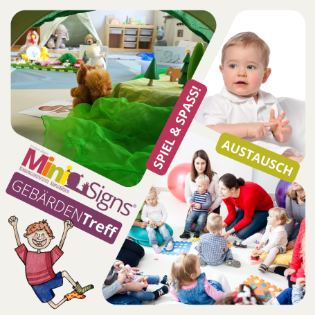 MiniSigns® ist ein bindungsorientierter Kurs für Eltern mit ihren Babys und Kleinkindern zwischen 6 und 18 Monaten. Mit viel Freude, Spiel, Liedern und Musik werden die Kleinen unterhalten, während die Eltern ganz nebenbei alltagstaugliche Gebärden erlernen, sowie Anregungen erhalten, diese zu Hause zu integrieren.